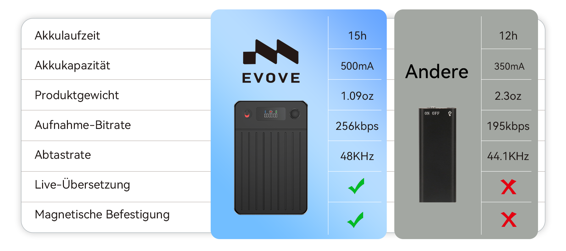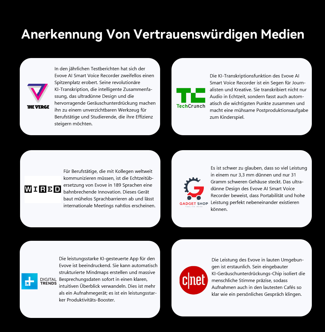 Der Evove AI Smart Voice Recorder war geboren. Er verfügt über eine leistungsstarke KI-Engine für die Echtzeit-Transkription und intelligente Zusammenfassung, und sein ultra-slim Design beinhaltet eine eingebaute KI-Geräuschunterdrückungstechnologie, die eine makellose Audioqualität gewährleistet. Dies ist das Kernversprechen von Evove: Ihren Geist zu befreien und Ihnen zu ermöglichen, sich auf das zu konzentrieren, was wirklich wichtig ist.