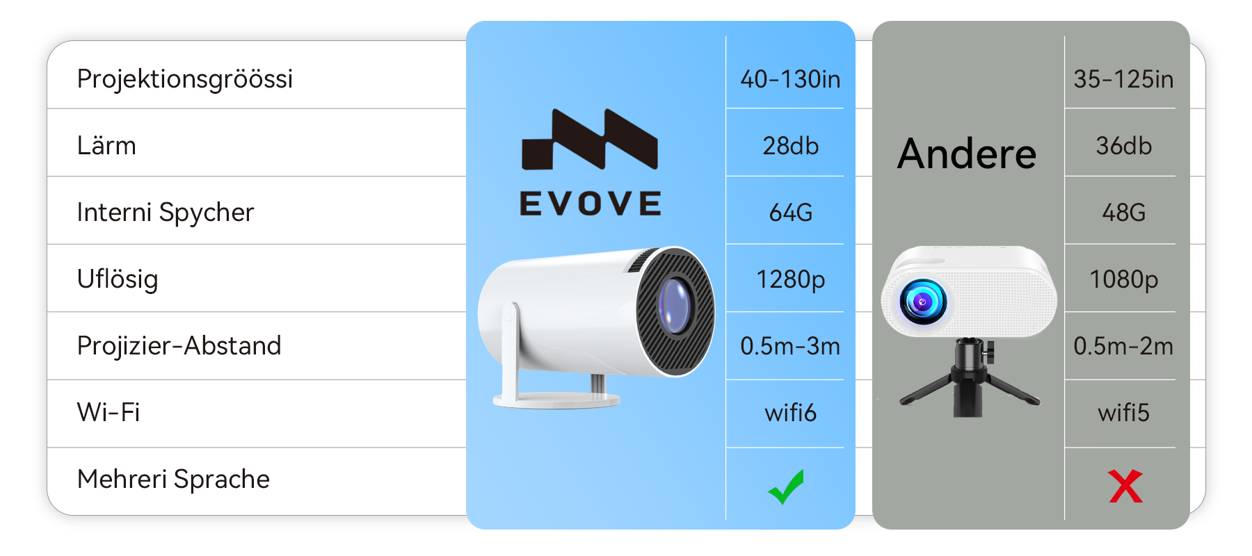 Da kam der Evove Mini Tragbare Projektor ins Spiel: klein genug, um ihn mit einer Hand zu halten, aber in der Lage, einen riesigen 130-Zoll-Bildschirm zu projizieren. Filmnächte sind jetzt einfach und mühelos, sodass Sie jeden Moment genießen können. Evoves Versprechen ist einfach: Freiheit für Unterhaltung zu bringen und Ihnen zu helfen, unvergessliche Erinnerungen jederzeit und überall zu schaffen.